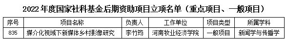 日前,全国哲学社会科学工作办公室发布了2022年度国家社科基金后期资助项目立项名单,我院李竹筠博士申报的《媒介化视域下新媒体乡村影像研究》获得立项。