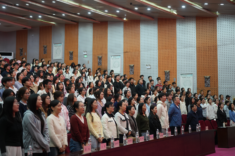 优秀教师代表公共法学教研室主任杨志民老师结合自身教学与工作经历,分享了对“文法人”身份的理解,鼓励新生们关注国家和社会发展,勤学奋进,砥砺前行,勇做时代的弄潮儿。老生代表两次国家奖学金获得者赵晏阳鼓励同学们在专业学习中沉下心,不浮躁、不盲从;在生活里存善念,懂感恩、肯担当;在未来的日子里,敢闯敢试、不畏挑战,努力成为有智慧、有担当、有温度的复合型人才。新生代表25级网络与新媒体专业孙天怡表达了对大学的憧憬和向往以及与同学们携手共进的昂扬斗志。最后,大会在与会人员齐声合唱《歌唱祖国》的歌声中圆满落幕。