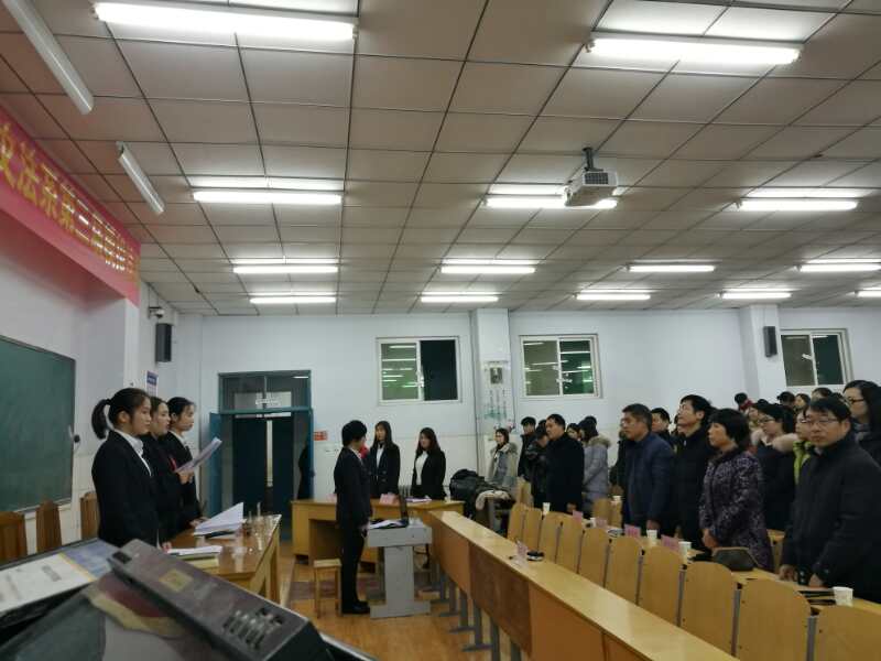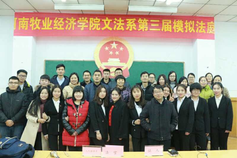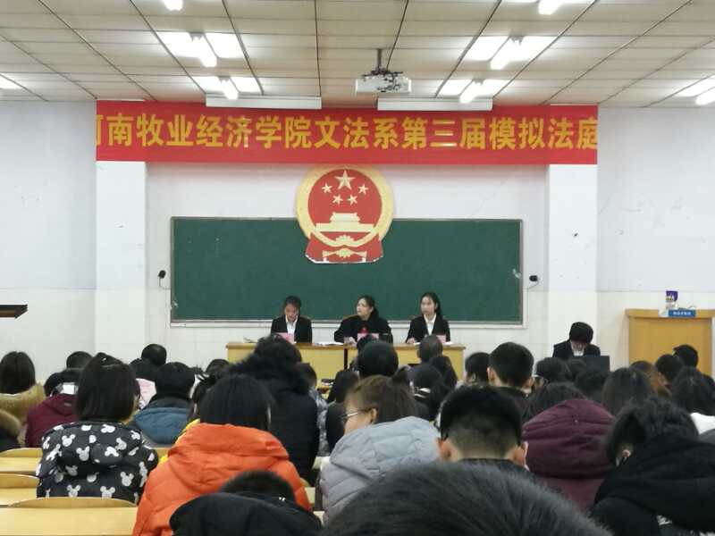 12月14日下午,由校宣传部主办,文法系承办的12.4法治宣传日系列活动之模拟法庭在E209教室举行。文法系主任李国英、宣传部老师袁凤友、文法系副书记王本聚、法律教研室老师以及法律和知识产权专业的全体同学参加了本届模拟法庭。郑州工程技术学院法律专业的部分学生也应邀出席了活动。