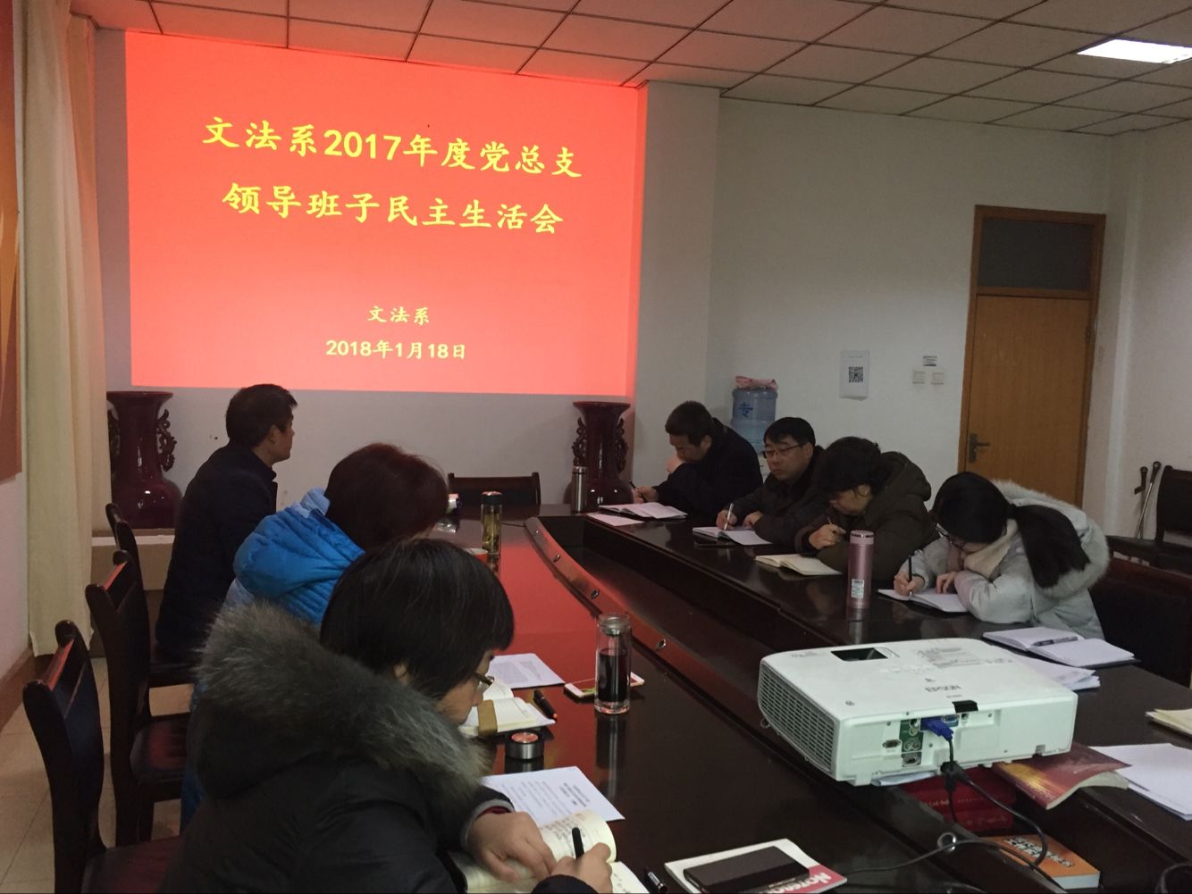 根据学校党委《关于开好2017年度处级以上领导班子党员领导干部民主生活会、组织生活会和开展民主评议党员的通知》文件要求,文法系党总支结合院系实际,周密安排,认真准备,广泛听取和征求意见,经校党委副书记李绍文书记对各项材料审阅、批示并指导指示后,于2018年1月18日上午,在系会议室召开处级领导班子党员领导干部民主生活会。文法系全体处级领导干部参加会议,系党总支委员、科级党员干部、党支部书记、民主党派代表及高级职称教师代表列席会议,会议由文法系党总支书记葛丽娅主持。