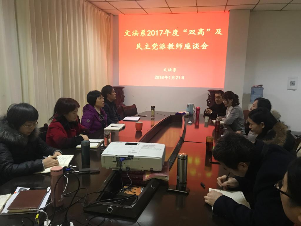 1月21日上午,文法系在系会议室召开了2017年度“双高”及民主党派教师座谈会。系领导班子全体成员、博士和在读博士教师以及民主党派教师代表参加了座谈会。座谈会由系党总支书记葛丽娅主持。