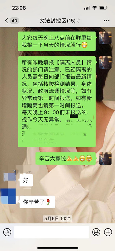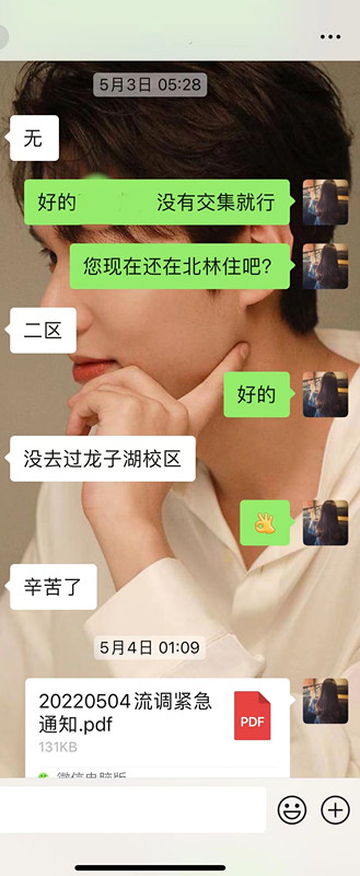 5月3日,我校疫情防控警报拉响,全校实行“静态管理”,进入战时状态。凌晨2点30分,她接到指令要求在6点前排查上报流调情况后,第一时间联系本院相关教师核实。由于是深夜,很多老师一时接不到电话,她就一遍一遍地打,并在微信中一个一个留言,彻夜未眠,终于在6点完成了排查工作。信息汇总上报后她又立刻赶往学校成为了一名核酸检测志愿者。