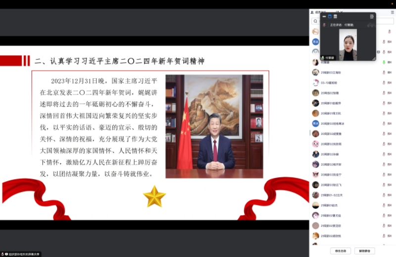 会上,学生党员王海世进行领学,带领全体学生党员们回顾了毛泽东同志领导中国革命、建设的伟大实践,高度评价了毛泽东同志为中华民族、中国人民建立的丰功伟绩,深刻阐明毛泽东思想的历史地位、科学价值和指导意义,号召全体学生党员们坚定历史自信,把握历史主动,始终保持蓬勃生机和旺盛活力,为中国式现代化宏伟事业不断奋斗。随后,学生第一党支部书记付慧婕结合会议主题进行讲话,她以毛泽东同志的几个故事为主线,向我们展示了毛泽东同志将一生奉献给党和人民,坚定不移坚持党的理想信念,带领中国革命走向成功的感人事迹。之后,付慧婕老师带领大家学习了习近平主席二〇二四年新年贺词精神。最后,她对全体学生党员们提出三点要求,一要加强理论知识的学习,从历史中学习党的宝贵精神财富,从时政中了解国内外大事,不断扩充知识面。二要积极参与到“返家乡”社会实践中,展现当代大学生的担当作为,提升使命感。三要发挥模范带头作用,在学习、工作、生活中做好表率作用。