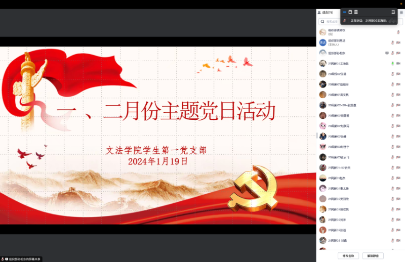 为增强党员党性修养,提升党员的思想觉悟和行动自觉,深入学习习近平总书记在纪念毛泽东同志诞辰130周年座谈会上的重要讲话精神,williamhill英国学生第一党支部于1月19日通过腾讯会议开展了一、二月份主题党日活动。本次会议由williamhill英国学生第一党支部书记付慧婕主持,williamhill英国学生第一党支部全体党员和部分入党积极分子参加。