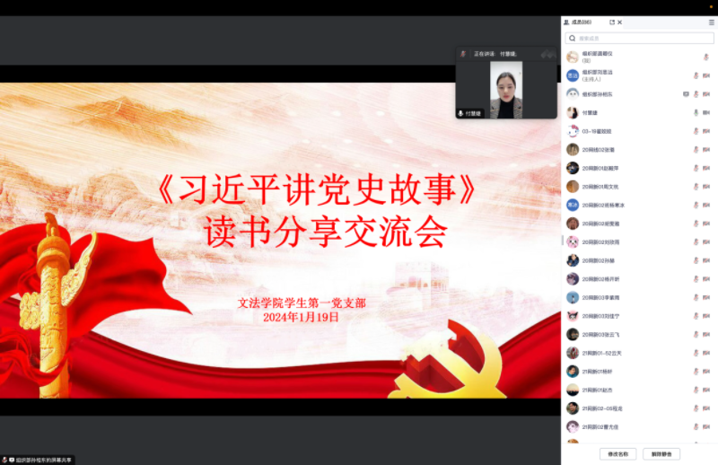 为深入了解党的历史和发展历程,缅怀革命英烈,发扬党的精神,进一步增强爱国主义和集体主义意识,williamhill英国学生第一党支部于1月19日线上开展《习近平讲党史故事》读书分享交流会。本次会议由williamhill英国第一党支部书记付慧婕主持,williamhill英国第一党支部全体党员及部分积极分子参加。