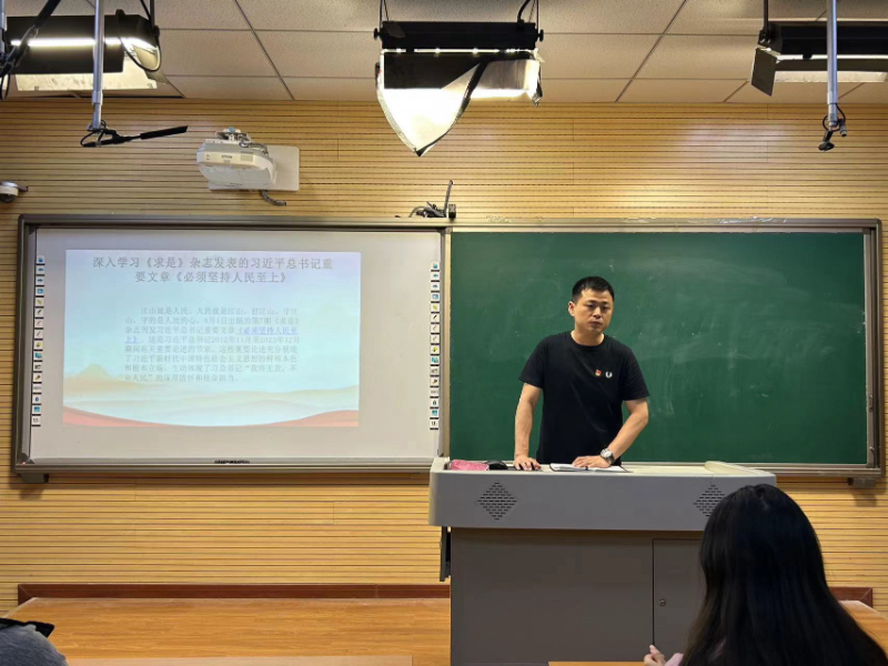 会上,学生党员赵锦硕进行领学。首先,她通过播放新闻联播中对人民性概念的阐述,加深同学们在学习生活中对人民性的了解。接着,她以坚持人民性作为核心要点,分别从“中国共产党人的初心和使命,人民至上的重要意义,马克思主义的本质属性”三个方面深刻揭示了“坚持人民至上不是抽象的、空泛的,而是具体的、现实的,必须体现在经济社会发展各方面各环节,体现在更好满足人民对美好生活向往的实践中”这一不争的事实。最后,她号召全体学生党员深刻领悟、全面贯彻落实人民至上这一重要理论思想,用实际行动为人民群众带来幸福感和安全感。随后,房书安、梁宸朝、潘环宇、岳耀博同志依次分享《习近平讲党史故事》读书心得,他们通过分享狼牙山五壮士、邱少云、黄大年、孙家栋等同志的先进事迹,呼吁全体学生党员在学习革命英雄英勇事迹的同时更要传承他们铭刻于骨血里的爱国精神和为人民奉献的崇高品质,坚定不移的为人民服务。最后,支部书记王兆北结合会议主题进行讲话,他指出人民群众是我党生存和发展的根基,正因为共产党始终保持与人民群众的血肉联系,才保证了我党在乱世中脱颖而出,带领人民走向新的辉煌。同时,他对学生党员提出了新的要求和期待,提出人民群众是时代浪潮的一滴滴水,党员作为时代的弄潮儿,应当不断积蓄能量,掀起一片片浪花,引领大家共同奔赴理想的星辰大海,为人民群众带来福祉,为中华民族伟大复兴做出贡献。