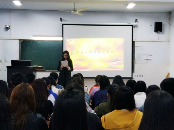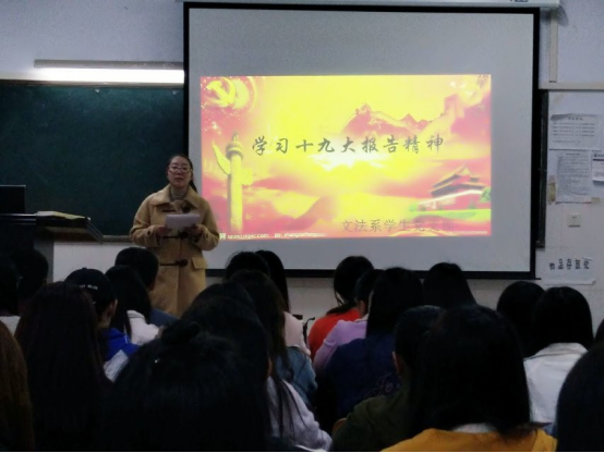 2017年11月2日下午,文法系学生党支部在教学楼A楼开展了以“学习十九大报告精神”为主题的交流会,专题学习十九大精神。会议分别由学生第一党支部书记李梦雨和学生第二党支部书记欧阳宇光主持。