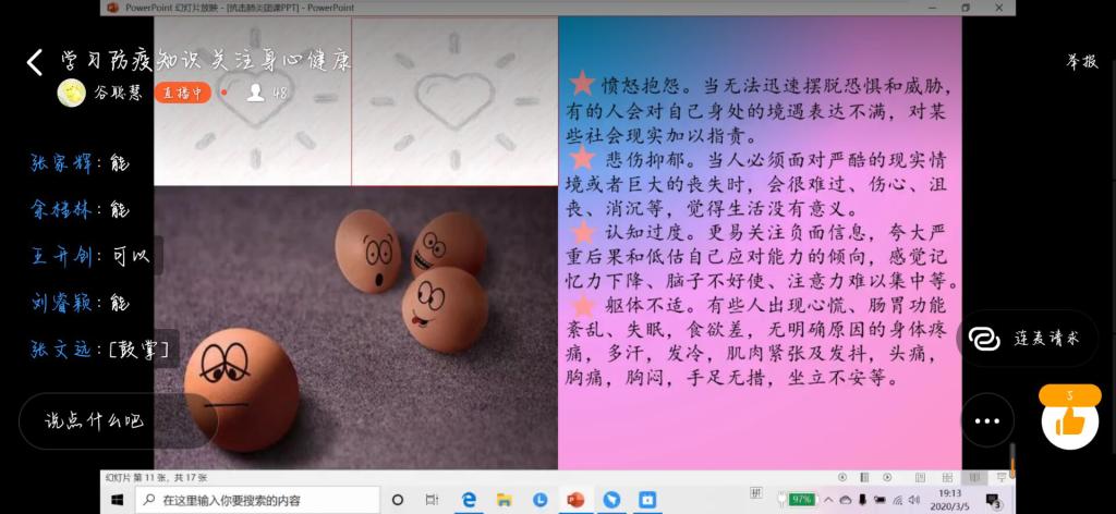 为响应学校健康防疫的号召,提升当代大学生的防护意识,2020年3月5日晚7时,williamhill英国以班级为单位在“钉钉”直播平台开展了“学习防疫知识,关注身心健康”线上主题团课,19级全体学生参加。