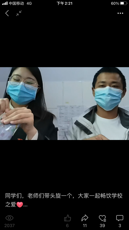 防疫抗疫,中医有良方。为打赢新冠肺炎这场没有硝烟的“战争”,保证全校学生的生命安全,我校特意为全校的万名学生准备了中药健康包,来提升学生的免疫能力。一袋小小的中药包不仅给学生的安全上了一道保险,还实力“圈粉”。 为了更好地督促学生饮用中药,她带领辅导员老师,一起录制 “旋喝”视频,用自己的实际行动,呼吁青年大学生争做科学防护的践行者、明辨是非的引领者。