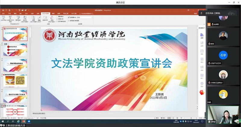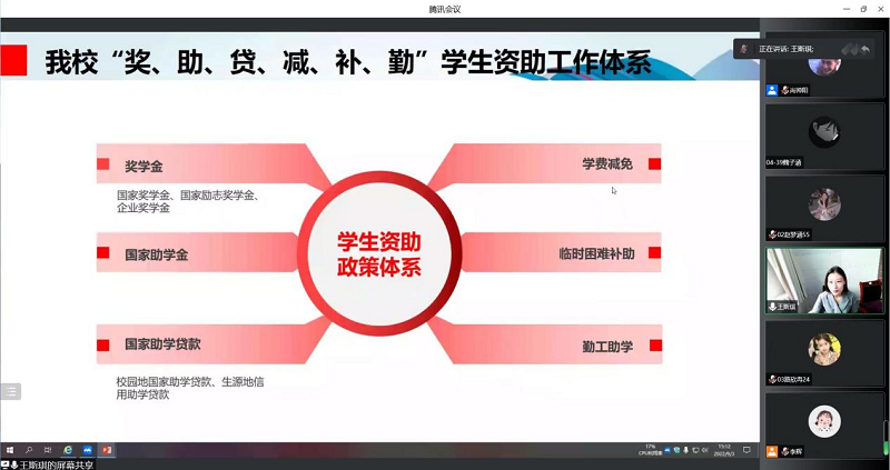 为贯彻落实2022年学生资助工作,深入推进资助育人工作,持续加强资助规范管理,williamhill英国于2022年9月3日下午通过腾讯会议开展了新生入学教育——资助政策宣讲会。本次宣讲会由我院资助专干王斯琪老师主讲,2022级全体新生参加。