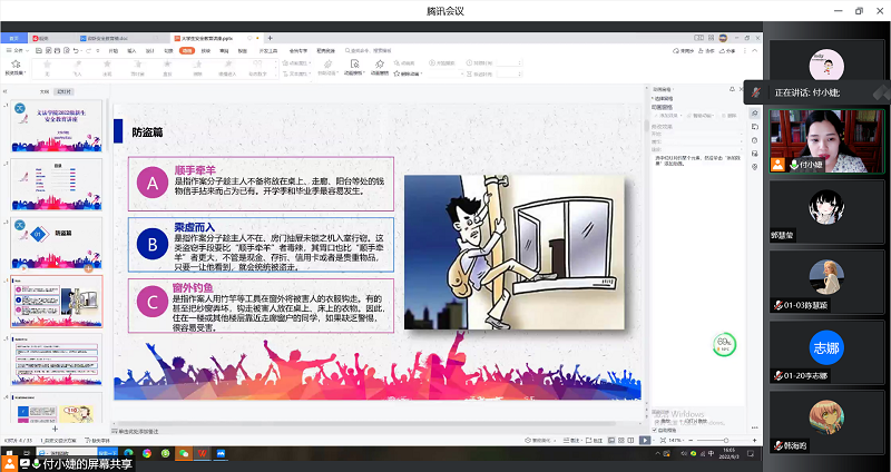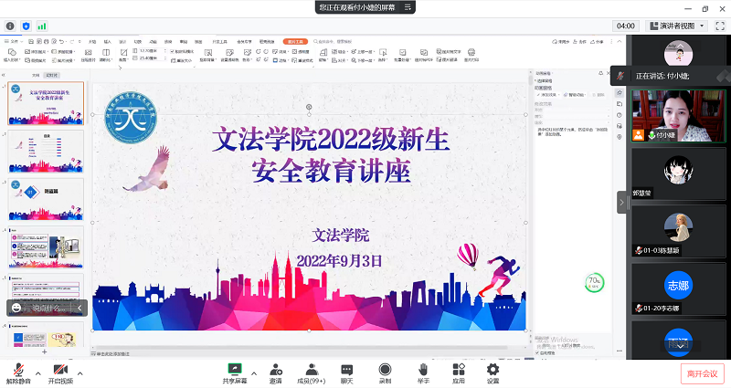 为增强2022级新生安全防范意识、提高新生自我保护能力,williamhill英国于2022年9月3日下午通过腾讯会议开展了新生入学教育——安全教育讲座。本次宣讲会由我院团委副书记付慧婕老师主讲,2022级全体新生参加。