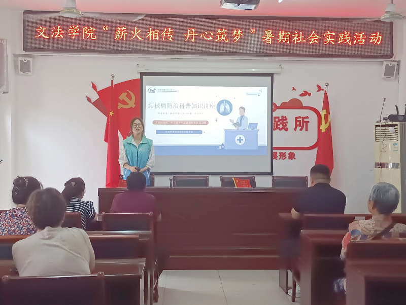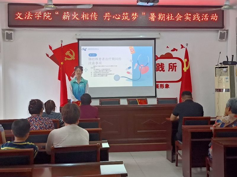 防治结核宣讲会上,宣讲团团长赵锦硕通过介绍活动的意义和目的,使大家认识到防治肺结核的重要性,随后,宣讲队成员赵冉通过播放短片向大家讲解结核病的基本内容,帮助村民正确认识结核病。接着,宣讲团成员方梦菲为村民们科普肺结核患者治疗期间的注意事项,加深村民们对肺结核的认识,提高其健康意识和防护能力。最后,宣讲团团长赵锦硕呼吁村民们要重视防范结核病,为维护健康的生活环境共同努力。
