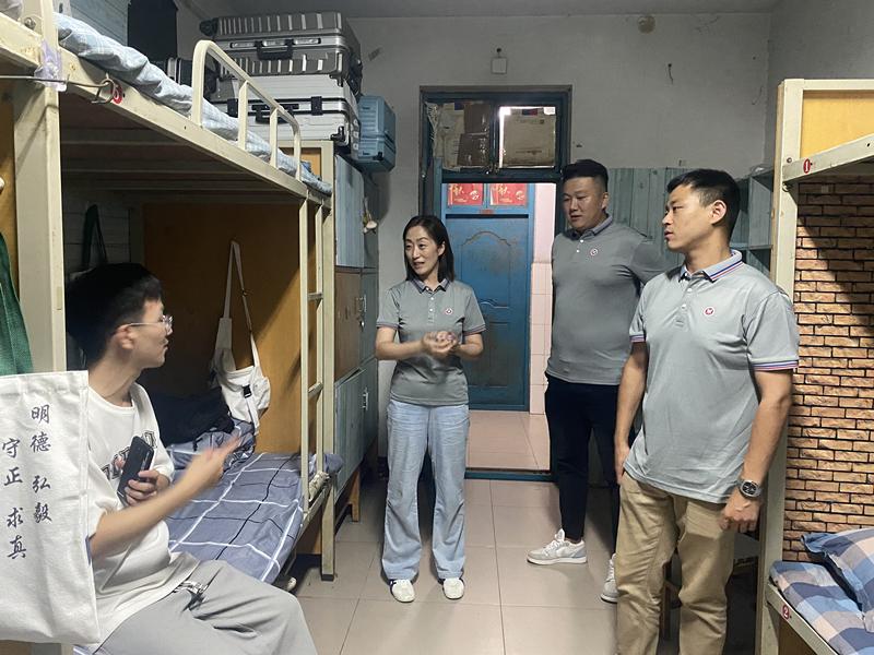 又是一年迎新季,关心走访为新生。为进一步关心2023级新生入学适应性问题,及时了解新生入校学习生活情况,9月10日下午18时,我院院长李国英、党委副书记买菁菁、团委副书记王兆北、新生班辅导员付慧婕、高干走访了2023级新生宿舍。