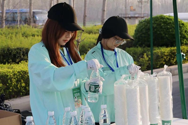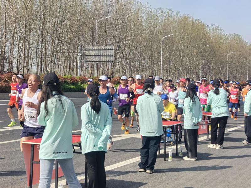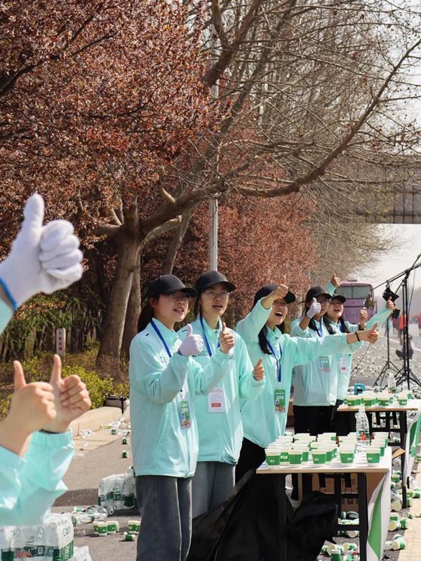 伴随着开赛笛声的响起,近5万余名选手激情开跑,沿着赛道一路向前。与此同时,现场加油声、呼喊声延绵不绝,跑友们热情似火,上演了一场万人狂欢的奔跑景象。比赛过程中,根据赛前培训,志愿者们采取前疏后密的纸杯摆放方式,并及时补水,保证水源充足。在人群高峰期,志愿者们分工明确,工作的同时不忘为运动员们呐喊助威,获得了运动员们热情的反馈。赛后全体志愿者及时清理赛道垃圾,恢复了赛道原本的整洁,获得了马拉松组委会的高度认可和赞扬。