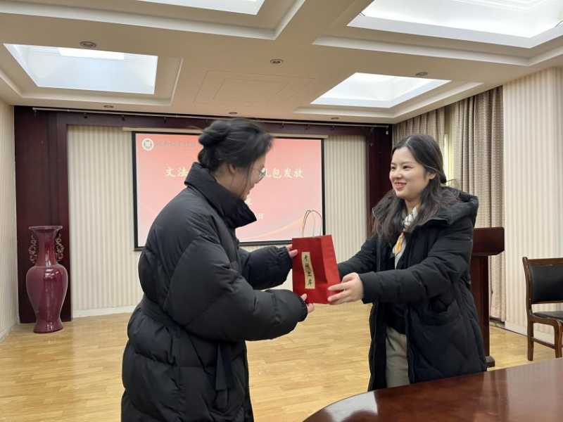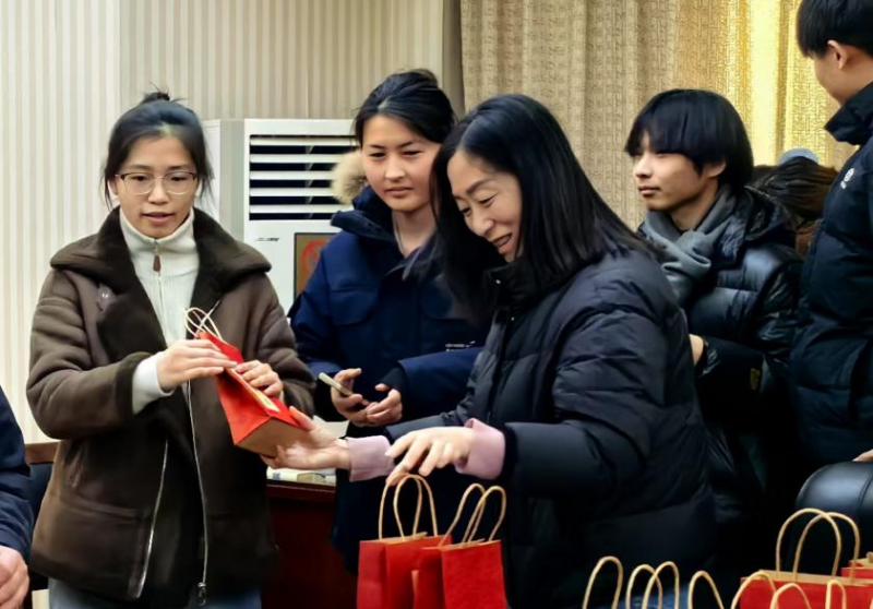 随后,党委副书记买菁菁,团委副书记付慧婕、王兆北以及各位辅导员纷纷行动起来,将一份份精心准备的考研礼包分发到同学们手中。礼包虽小,却心意满满,里面装着能在寒冷冬日为学子们送去温暖的暖贴、寓意着旗开“德”胜的德芙巧克力、承载着老师同学们殷切祝愿的手写祝福卡、方便使用的纸巾、还有象征着对大家考研成功美好祝愿的祝福挂件。