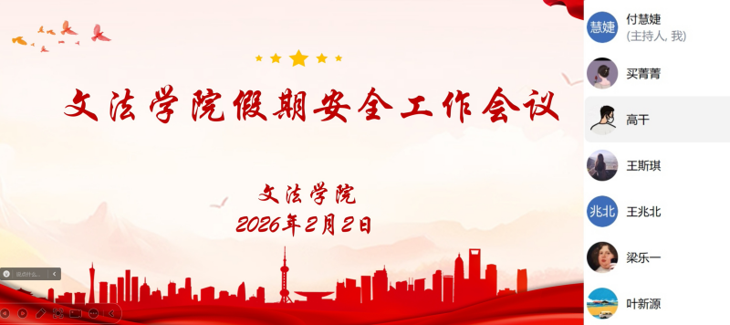 会上,买菁菁传达了学工部关于假期安全稳定工作的相关要求,她强调,春节假期是安全稳定的重要节点,要及时了解好学生的假期去向问题,及时更新学生动态,做到横到边、纵到底,全方位了解学生情况。随后,她针对会议内容,讲了五个方面。一是安全教育不断线。通过多种途径,定期开展交通出行、消防安全、网络安全、极端天气防范等常识宣传普及,加强反诈安全教育,告知学生警惕各类高发骗局,增强安全意识和自我保护能力。二是加强家校协调,做好重点人群的关注。单亲家庭、贫困家庭、学业就业困难学生要积极关心关爱,可通过实地走访、电话慰问等形式动态掌握学生思想生活状况,将帮扶措施落实到位。三是做好风险研判和隐患排查,完善应急响应机制,畅通信息报送渠道,遇到突发事件严格按照程序及时上报。四是做好学生思想引领教育工作,严格做到教育与宗教相分离,不信教、不传教。五是倡导良好的生活方式,不熬夜、不通宵打游戏,帮助父母做家务,与父母聊聊天,学习做饭、驾驶、剪辑等新技能,充实快乐度过一个平安幸福的假期。最后,各辅导员汇报了所带班级的学生情况。