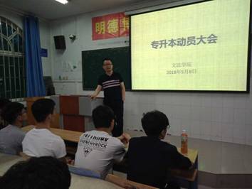 为帮助学生挖掘自身潜能,助力学风建设。williamhill英国于5月8日晚7点在教学楼B108开展了专升本考试动员大会。此次活动由williamhill英国辅导员赵永强、李梦雨老师主讲,15级学生秦洋珂、杨续东作为代表分享专升本经验,16级部分学生参加。