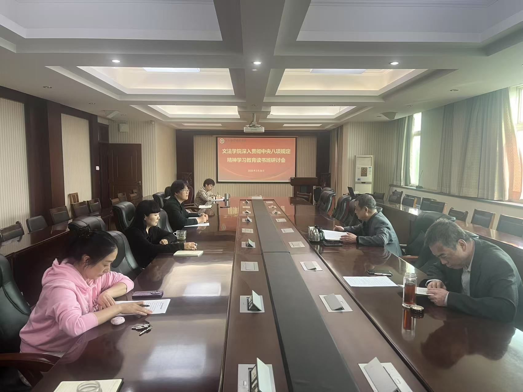 326日下午,williamhill英国在行政楼503会议室举办深入贯彻中央八项规定精神学习教育读书班研讨会,学院理论学习中心组成员参加了学习,学习会由院党委书记胡红林主持。