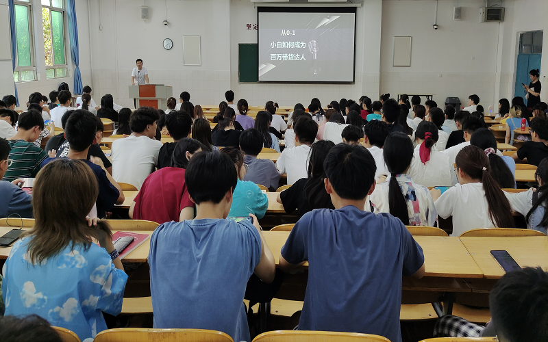 宣讲会上,该团队的负责人先给同学们介绍了直播电商的火爆现状,用习近平总书记在陕西农村直播带货卖木耳的案例,描述了直播行业蒸蒸日上的现状。接着,他向同学们抛出一个问题:“你为什么不做主播?”同学们的回答可谓精彩纷呈、各具特色:没有技术、没有人气、没有团队、没有赞助商等。接着,负责人从肯吃苦、有特点、专业、全心投入、学习能力强和直播间转化率这六个方面点出了做主播应有的能力素养,给同学们做参考。最后,他指出这次宣讲会的最终目的——本届新媒体运营和网络直播大赛要用流量、资源、技术支持来吸引鼓励同学们的参与,以赛助创,以赛助培,以赛助销。