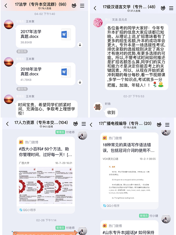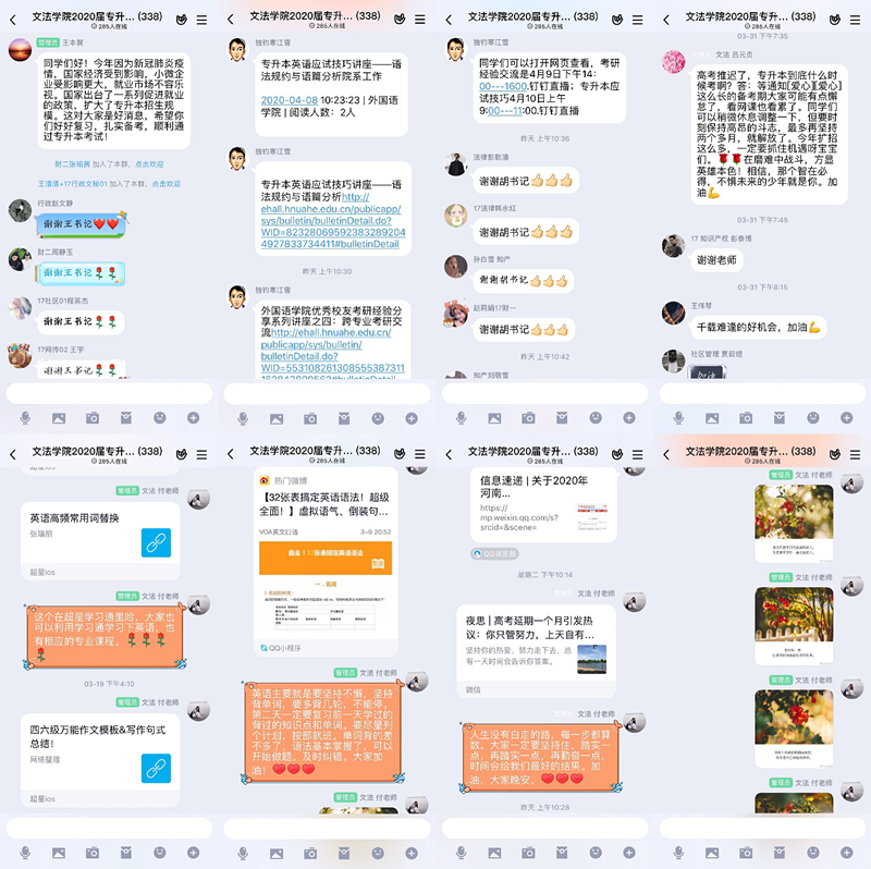 williamhill英国是专升本报考率高,今年报考比例达到了本院毕业生的93%。我院领导高度重视毕业生就业工作,专门按照学科建立了专升本复习指导群,密切关注学生的复习情况,及时提供有效的复习信息、专升本真题,并且邀请了教研室老师在线解疑答惑。辅导员们也利用互联网开展心理辅导和复习方法指导。通过一系列的专升本网上指导活动,鼓励了专升本学生的备考信心,帮助升本学生找到了复习方法,为我院毕业生就业工作打下良好的基础。