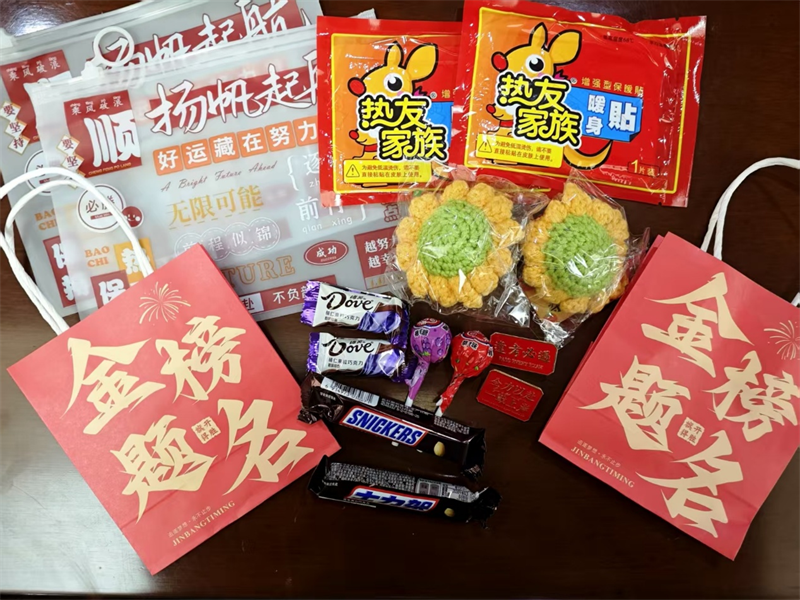 随后学院领导老师们纷纷行动起来,将一份份精心准备的考研礼包分发到同学们手中。礼包虽小,却承载着沉甸甸的祝福,里面装着能在寒冷冬日为学子们送去温暖的暖贴、寓意着旗开“德”胜的德芙巧克力、祝愿同学们考试“给力”的士力架、方便使用的文具袋、寓意同学们能够一举夺魁的向日葵钥匙圈、给同学们加油鼓劲的棒棒糖、还有象征着对大家考研上岸美好祝愿的加油徽章。