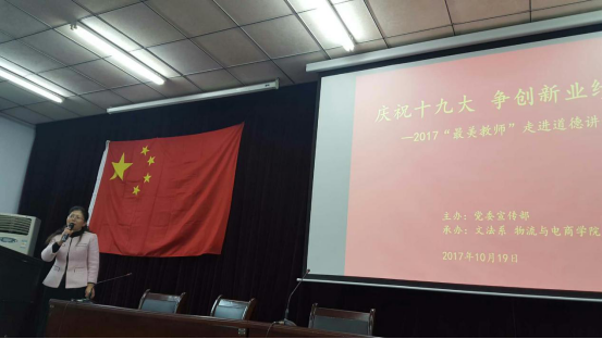 不忘初心,牢记使命。在党的十九大胜利召开之际,10月19日下午,由党委宣传部主办,文法系、物流与电商学院承办的2017“最美教师”走进道德讲堂活动在E110顺利举行。党委宣传部副部长、文明办主任吴达,文法系、物流与电商学院师生参加了此次活动。