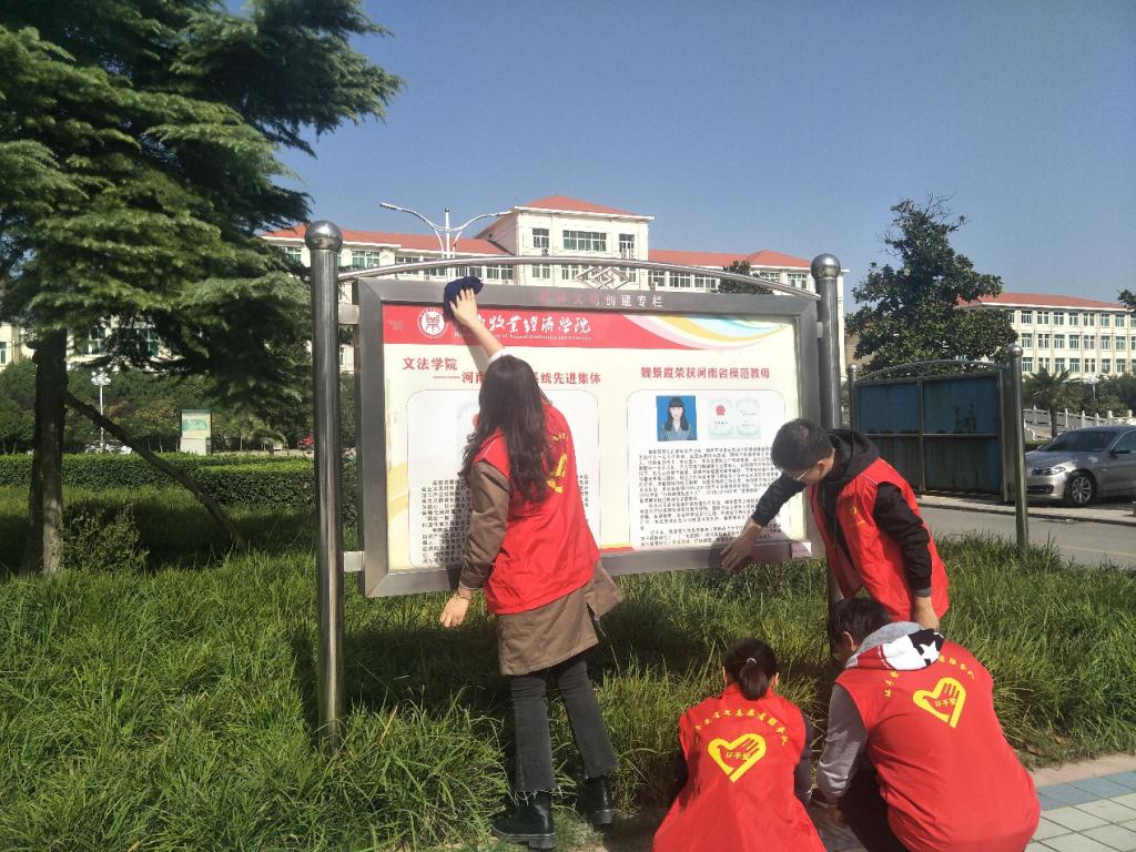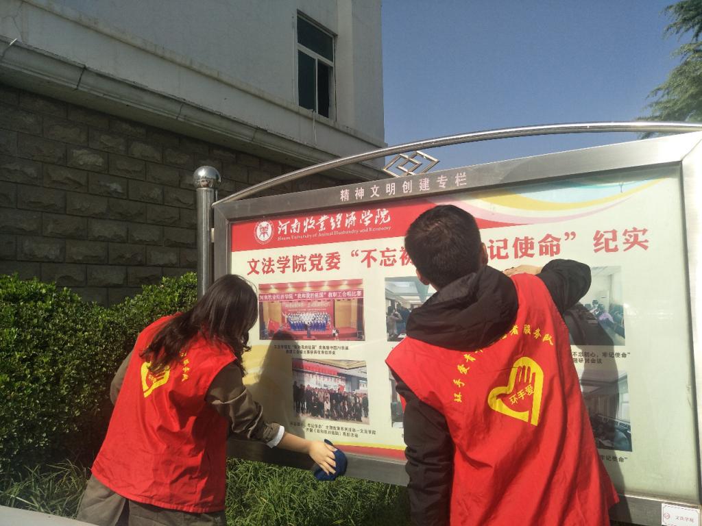 为认真做好2019年省级文明校园创建迎评工作,提高学生文明卫生意识,营造一个清洁、整齐、优美的校园环境,10月28日上午,文法学院环手爱志愿者积极参加了文明校园卫生清扫活动,重点清理了宣传栏、校园墙面牛皮癣小广告、餐厅白色垃圾等卫生死角。