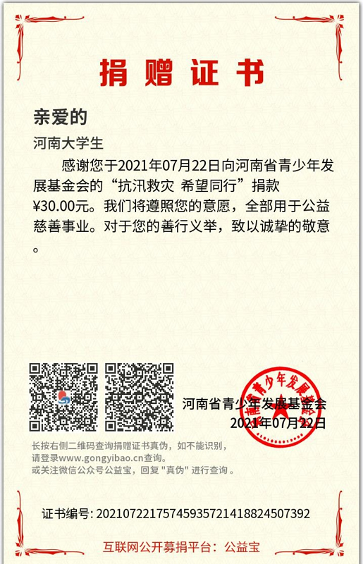 当看到家乡受灾,河南经历特大暴雨,20知产02班的王文举同学感到心里很难受。暑假在外参与实习,无法前往一线参与志愿救援,虽身在外地,心里却挂念家乡人民,随即通过郑州市红十字会、河南省青少年发展基金会,进行线上捐款,愿洪水早日散去,国泰民安。