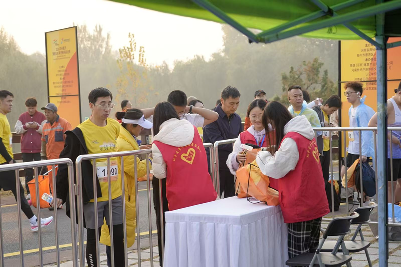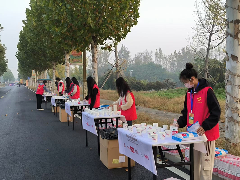 为确保比赛的顺利开展,环手爱青年志愿者们于11月9日前往组委会,进行参赛物资的发放,协助参赛者们签订承诺书。志愿者们始终坚持岗位,圆满完成各自所负责的工作。在志愿服务过程中,志愿者们早早来到比赛现场,进行着紧张而有序的准备工作。尽管赛事当天气温较低,但志愿者们热情高涨。他们始终面带微笑,以饱满的精神为每位选手提供暖心服务。各个岗位上的志愿者各司其职:起点和终点处的志愿者,帮选手存取衣物、协助裁判维持秩序,保证比赛公平公正;补给站的志愿者为选手提供饮用水和食物,并为他们加油助威;赛道沿途的志愿者为选手指引方向、提供医疗救助等服务。整个赛程中,志愿者们的加油声和鼓励声此起彼伏。