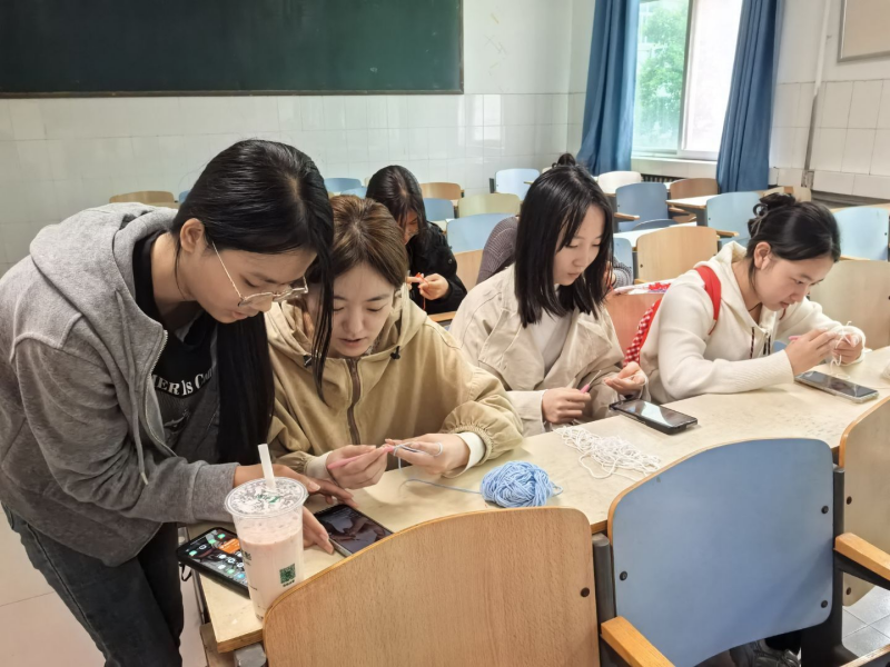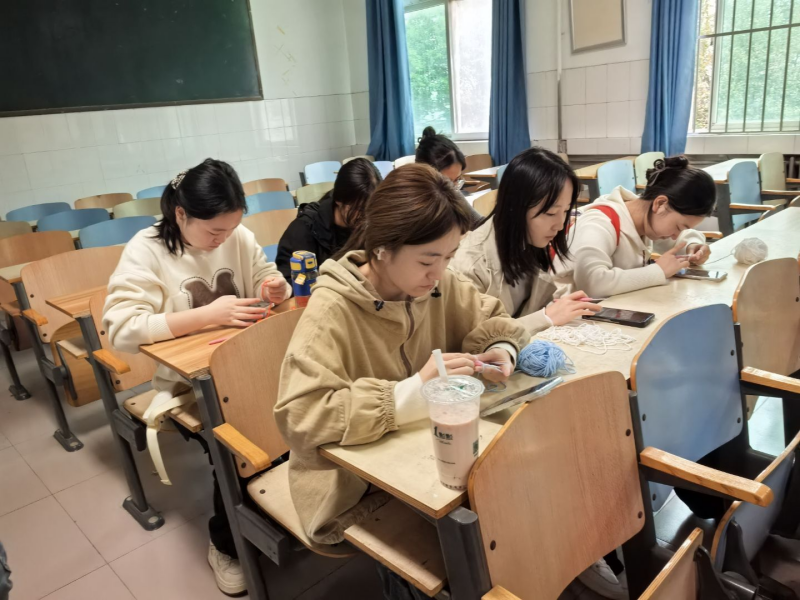 从最基础的握针姿势、绕线方法,到逐步掌握“锁针”和“短针”等针法,初学者们在同伴的耐心指导下很快度过了最初的生涩期。指尖翻飞间,一根根简单的毛线开始初具雏形,逐渐变成一朵朵可爱的小花、一颗颗精致的爱心,或是一条条充满生命力的小鱼。空气中弥漫着毛线的柔软触感与同学们专注而愉悦的交流声。