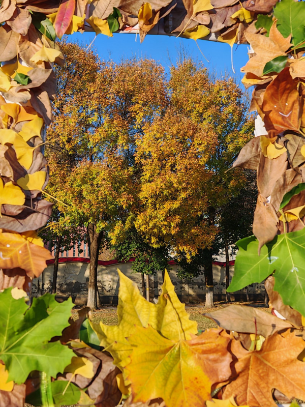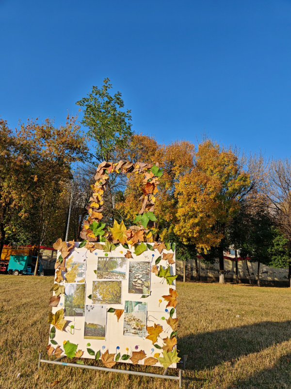 活动筹备阶段,服务队的同学们利用课后时间分工协作:有人负责在校园步道、绿化带收集银杏、梧桐等自然脱落的落叶,按叶形、颜色分类整理;有人提前一周拍摄了校园里的秋景,洗印成照片备用;还有同学用卡纸制作了一个简易复古相框,将落叶按暖色调渐变的顺序粘贴在相框边缘,中间留出空位方便同学们入镜。