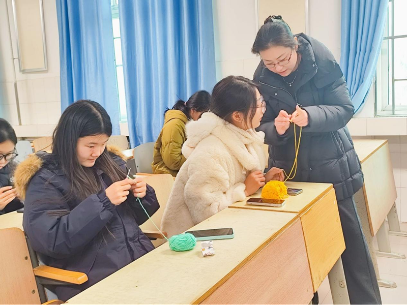 活动现场暖意融融,钩织教学由经验丰富的薛老师全程负责。“大家先把线绕在钩针上打个活结,这是锁针的基础,注意力度要均匀,不然线迹会松紧不一。” 活动伊始,薛老师手持钩针和毛线,一边放慢动作示范,一边细致讲解锁针、短针等基础针法要领,从持针姿势到拉线力度、针脚疏密控制,每个细节都清晰易懂。针对部分学生初次接触钩织、动作生疏的情况,薛老师逐一上前手把手纠正手法,“你看,短针要插入前一行的针目里,钩线时手腕轻轻用力,这样织出来的成品才平整”,耐心解答疑问,现场学习氛围浓厚。