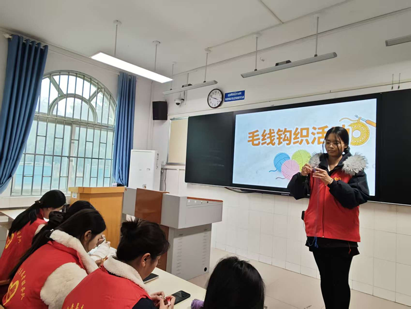 在薛老师的悉心指导和同学们的互助交流中,彩色毛线在指尖逐渐成型,小巧精致的杯垫、可爱的毛绒挂件纷纷涌现。背景屏幕上 “毛线钩织活动” 的醒目主题,与 “环手爱” 旗帜的爱心标识遥相呼应,让传统手工实践与青年文化体验深度融合,营造出 “人人参与、互助有爱” 的良好氛围。“特别感谢薛老师的耐心指导,原本以为钩织很难,没想到跟着老师一步步学,很快就掌握了技巧,还感受到了传统手艺的魅力。” 一位学生展示着作品,满脸成就感。