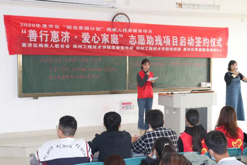 10月25日下午两点,williamhill英国环手爱青年志愿者服务队于郑州工程技术学院(金河校区)参与“善行惠济,爱心家庭”志愿助残项目启动签约仪式。