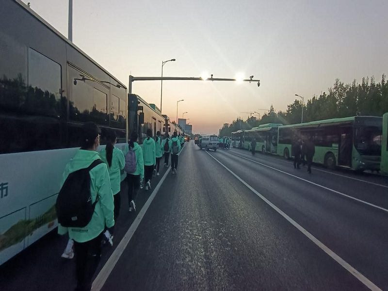 为保障提前到岗服务,凌晨三点,身着绿色志愿服的志愿者们已经集合完毕,一同前往志愿服务地点。历经一个小时的车程顺利到达服务场地,那时的天空还是灰蒙蒙的。稍作停顿,50名志愿者分为5队,并由各队长带领前往服务地进入到工作状态。随着时间的推移,来往的志愿者车队与参赛者车队一辆接着一辆,人也开始多了起来。