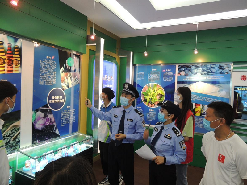 接着,志愿者们来到禁毒宣传展厅,里面摆放了各式各样的毒品样例,以及VR体验设备,志愿者们认真倾听王警官的讲解,认识到了现如今的各式毒品与近年来禁毒工作取得的显著成效。随后,志愿者们观看了关于禁毒的宣传片,了解到了我国青少年沾染毒品的原因以及毒品给人们的生活带来的危害。宣传片放映结束,同学们积极发表对此次活动的感想。在王警官的提议下,同学们在台前集合,举拳宣誓,并现场签名以示远离毒品的决心。