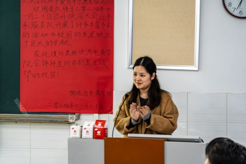 新的篇章已经开启,第十一届环手爱队长袁方对过去一年的志愿服务进行总结和回顾,同时也对环手爱新的征程表示期待。时代的接力棒已然交接,新一届环手爱青年志愿者服务队队长李欣睿发表了就职演讲。她分享了自己的志愿经历和感受,表示将带领新一届服务队继续发扬志愿服务精神,为社会注入青年志愿者的力量。会议继续大会进行了队旗交接仪式,新的命运的齿轮开始转动。最后,以2024环手爱年度年度总结视频为这次大会画上了圆满的句号。此次换届大会不仅是对过去一年工作的总结与回顾,更是对未来发展的规划与展望。相信在新一届环手爱成员的协手共进下,将会创造更加美好的明天!