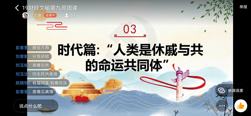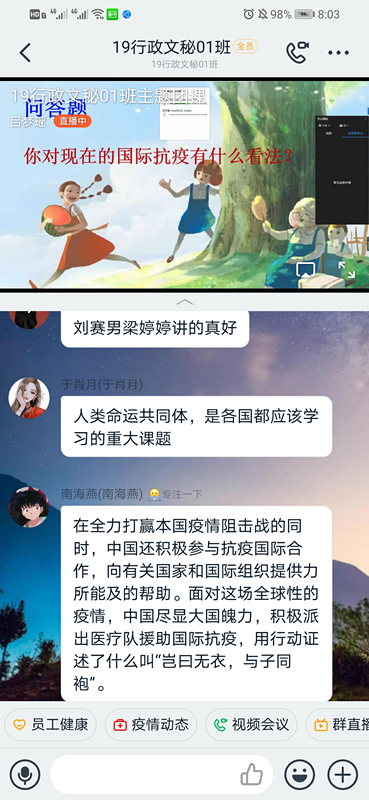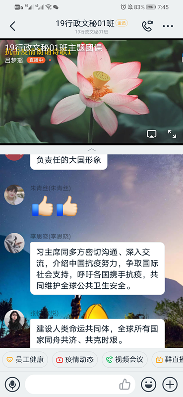 为了解我国与海外新冠肺炎防控工作的合作情况,增强对人类命运共同体的认识,williamhill英国于4月9日晚7:30在“钉钉”网络直播平台上开展了“书写共建人类命运共同体的战“疫”篇章——习近平主席推动新冠肺炎疫情防控国际合作”线上主题团课,19级学生全体参加。