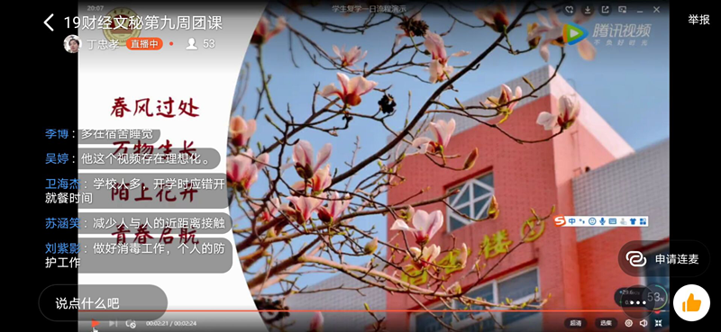 此次团课学习了习近平总书记“构建人类命运共同体”的重要论述,使同学们坚定了战胜疫情信心,同时也为复学做了必要准备。