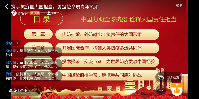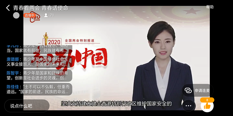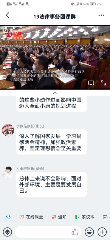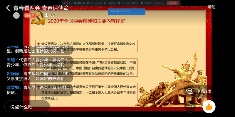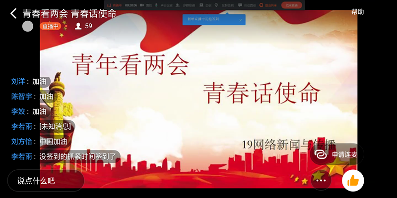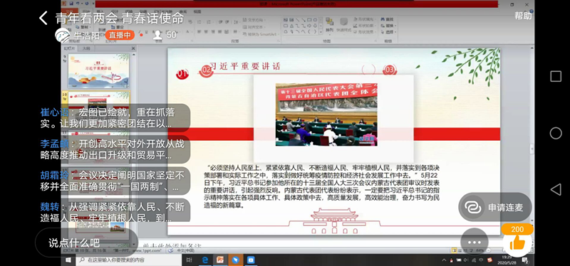 为引导同学们学习两会精神,自觉承担历史使命,williamhill英国于5月28日晚7点在“钉钉”网络直播平台开展了“青年看两会,青春话使命”线上主题团课,19级全体学生参加。