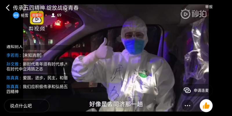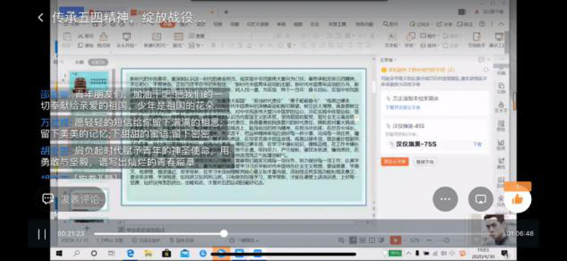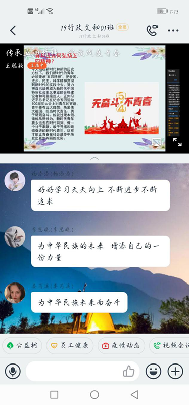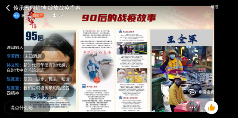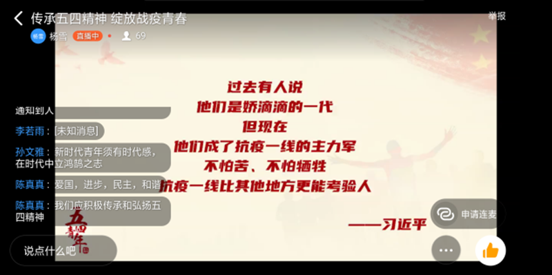 本次团课从“ 回顾五四运动,传承先辈精神”、“青春在战疫中绽放绚烂之花”、“在战疫中放光发热青春力量”这三个方面开展。团课上,主讲人带领同学们回顾了五四精神在中国的传承与发展历史。主持人指出,五四运动是一场爱国运动,在这场运动中,青年奋力而起,为当时黑暗的中国寻找光明的道路。接着,主讲人讲述了在抗疫中,成千上万的青年奋战在一线,躬身践行青年一代责任和担当的英雄事迹。最后主讲人将画面切入到河南省共青团的“传承五四精神,绽放战役青春”主题直播,走进“豫团直播间”,聆听第24届“河南青年五四奖章”获得者代表、“新时代河南向上向善好青年”获得者代表”讲述抗“疫” 一线故事、重温平凡却伟大的点滴时刻,同学们亦结合所感所悟在评论区积极讨论。