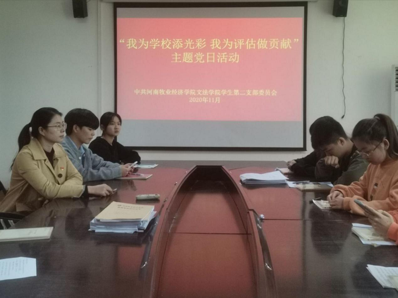 为发挥先锋模范作用,为即将到来的本科评估贡献力量,11月12日中午,文法学院学生第二党支部在行政楼515组织召开了“我为学校添光彩,我为评估做贡献”主题党日活动。本次活动由学生第二党支部书记吕元贞主持。
