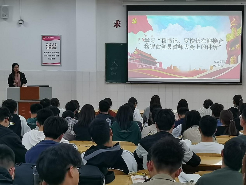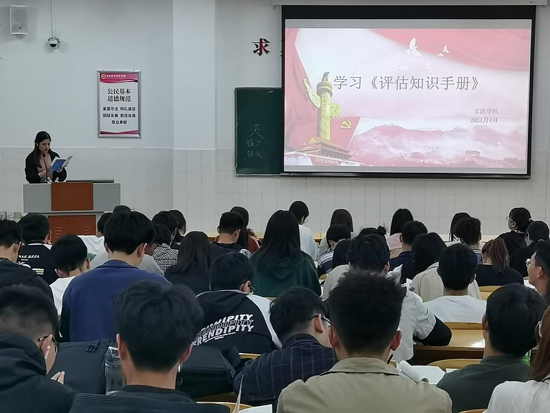 会议伊始,付慧婕书记向同学们说明了此次评估是对我校本科教学工作、师生精神风貌和学校各项工作的一次全方位评价,更是一次通过展示学生综合素质、实践能力来反映我校本科教学工作水平的良好契机,强调同学们身为文法人要提高认识,理解迎评,积极向上,优化学风,文明修身,展示风采,齐心协力,主动担当。随后,带领大家共同学习了《穆书记、罗校长在迎接合格评估党员誓师大会上的讲话》和《评估手册》,对于同学们提出了具体的要求和言行举止需要注意的方面。最后,要求大家传承“尚严崇实,善知敏行”校训,积极配合各项迎评工作,共同为我校顺利通过本科教学合格评估努力。