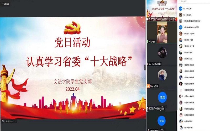 为加强学生党员的理论素养,提高学生党员政治理论水平,williamhill英国于4月25日晚通过腾讯会议组织开展以“认真学习省委‘十大战略’”为主题的党日活动。本次活动由williamhill英国学生第一党支部书记付慧婕主持,学生第一党支部全体学生党员参加。