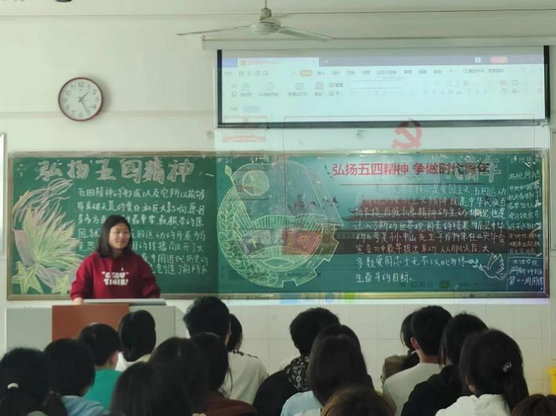 主讲人带领同学们认真学习了习近平总书记《在纪念五四运动一百周年大会上的讲话》和《在庆祝中国共产主义青年团成立100周年大会上的讲话》,鼓励广大青年要牢记习近平总书记的殷切嘱托,教育引导广大青年自觉担当时代重任,勇于砥砺奋斗,勇做走在时代前列的奋进者、开拓者、奉献者。随后,通过播放相关短视频,使同学们了解了五四精神的深刻内涵,进一步激发了同学们做习近平新时代中国特色社会主义思想的坚定信仰者、忠实实践者。