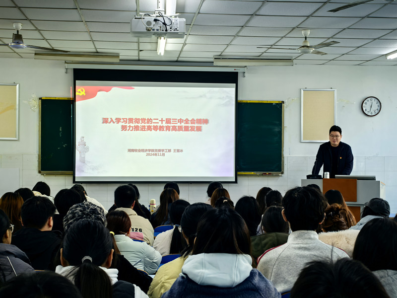 为深入学习贯彻党的二十届三中全会精神,加强青马工程学员思想政治建设,提高同学们的政治理论水平,williamhill英国于11月29日中午十二点半在E103教室开展“深入学习贯彻党的二十届三中全会精神 努力推进高等教育高质量发展”宣讲会,本次党课由校党委学工部思政科科长王雪冰主讲,本期青马工程学员参加。
