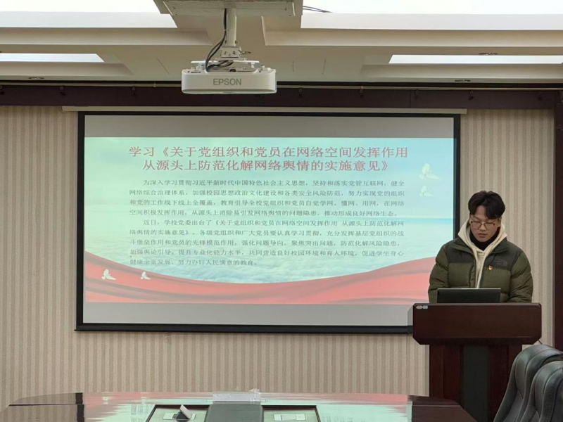 会上,支部书记付慧婕首先强调互联网已深度融入社会各领域,党管互联网是确保网络空间沿着正确政治方向、价值取向、舆论导向发展的关键。习近平总书记曾讲过,“过不了互联网这一关,就过不了长期执政这一关。”在校园中,一方面要强化思想政治教育在网络平台的渗透,打造红色校园网络文化品牌,通过开设思政课、线上主题班会等形式,引导学生树立正确价值观。另一方面,严密防范网络诈骗、信息泄露、网络暴力等安全风险。建立校园网络安全预警机制,定期开展网络安全培训与演练,打造安全和谐的校园网络环境。防范化解风险隐患,营造良好教育环境,推动教育改革创新,努力办好人民满意教育,为国家培养德智体美劳全面发展的社会主义建设者和接班人。随后,学生党员崔明聪领学了具体内容。他呼吁学生党员们起先锋模范作用,培育积极健康、向上向善的网络文化,营造向上向善的良好的网络环境,鼓励其他学生党员发扬人民至上、忠诚于党的精神,加强理论学习,提高个人素质和能力。最后,支部书记付慧婕对此次会议做出总结,再次强调广大党员要认真学习贯彻《关于党组织和党员在网络空间发挥作用从源头上防范化解网络舆情的实施意见》文件精神,充分发挥基层党组织的战斗堡垒作用和党员的先锋模范作用,强化问题导向,聚焦突出问题,防范化解风险隐患,加强舆论引导,提升专业化能力水平,使互联网成为传播党的声音、凝聚民心的有力阵地,让学生们在风清气正的网络环境中共享信息文明成果。