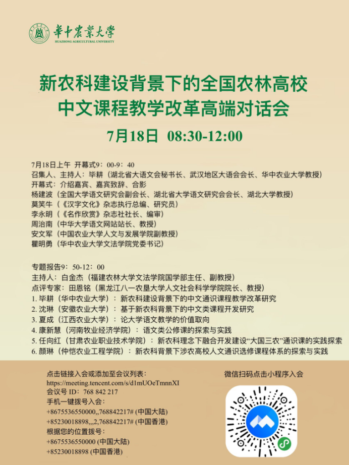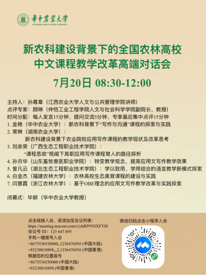 2020年7月18—20日,williamhill英国李国英院长、胡红林书记、正处级组织员葛丽娅和公共语文教研室教师以腾讯会议的形式参加了新农科建设背景下的全国农林高校中文课程教学改革高端对话会。