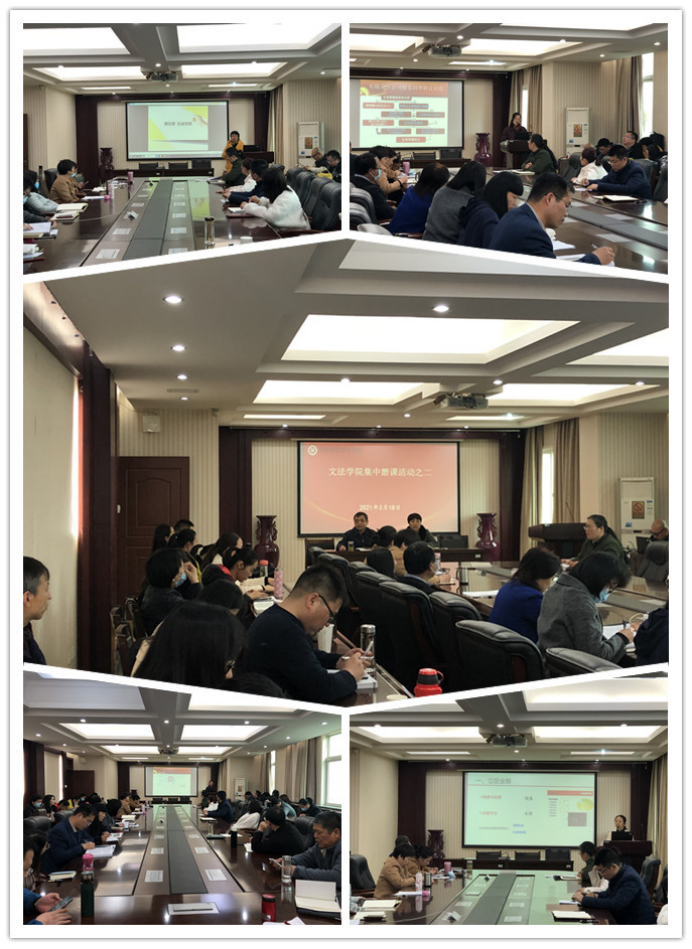 首先,王伟琴副院长回顾了上一次磨课的情况,介绍了本次磨课的基本情况,强调了磨课的要求。接着,家政学教研室吴静老师、法律教研室周可可老师、新闻传播教研室穆冬霞博士依次进行了磨课。三位教师磨的课程分别是《社会学概论》《经济法》《网络舆情监测与研判》。最后,学院教学督导委员会成员书记胡红林、院长李国英、副院长白慧颖、副院长王伟琴、家政学教研室主任张会霞、法律教研室主任杨志民、新闻传播教研室主任魏景霞等分别对三位教师的磨课进行了点评分析。大家一致认为三位老师磨课的共同之处在于均紧密围绕立德树人的根本任务,课程教学目标明确、思路清晰,生动形象,时间安排合理;不同之处在于吴静老师适当运用了线上线下混合式教学,周可可老师突出了逻辑推理的严谨性,穆冬霞老师重点在从现象到本质的案例分析。