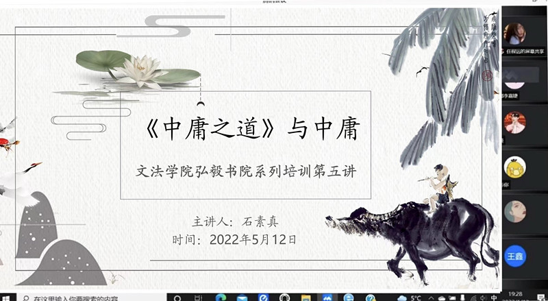 5月12日晚,williamhill英国弘毅书院通过腾讯会议开展了系列培训第五讲《中庸之道》与中庸。本次课程由杨昀老师主持,全体学员认真收看了由石素真老师主讲的视频回放。